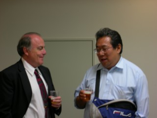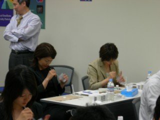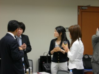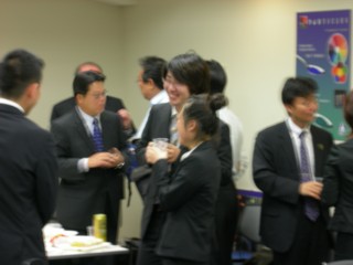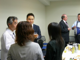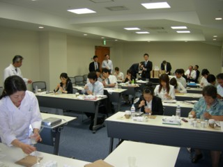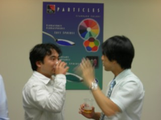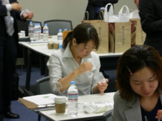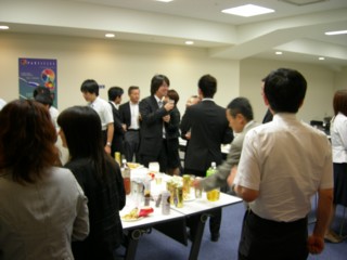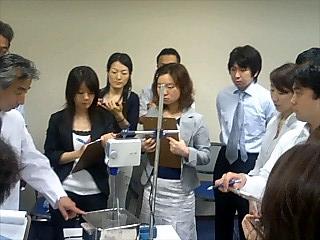 を使用した乳化方法について説明させて頂いた後、全員参加によるデモ実験を行いました。『フローラソルブズ』シリーズをご使用頂き、機械を一切用いず、人の手による攪拌でD相乳化を行うという体験を、参加者の方々にも挑戦して頂きました。また、セッション終了後は懇親会を開催し、気楽な雰囲気の中で歓談を楽しんでいただきました。
