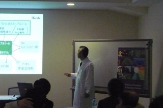 K-20W』は多機能性を持つ興味深い化粧品原料であり、見方を変えることにより、脂肪酸カリ石けん、アルカリ剤、アニオン界面活性剤、等と見なすことが可能でございます。今回は乳化状ホホバアルコールという見方をして、ヘアカラー(酸化染毛剤)に配合した場合の染毛効果向上についてデモ実験を行いながら説明させていただきました。第二部では『フローラソルブズ