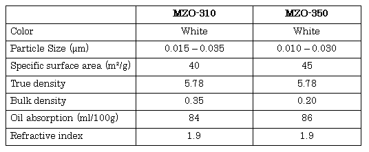 agent. Specialities of MZO series * finest particle size with its smart distribution. * highest purity of 99.9% or over * great absorbability in U.V. area * very stable against U.V. as a much developed inorganic crystal while organic sun screen agent is easy to decompose due to U.V. absorption for a long time. |