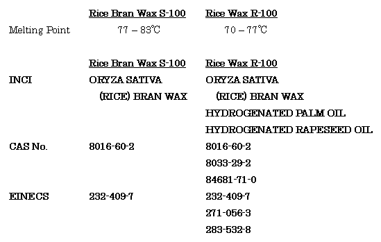 | RICE BRAN WAX S-100 and RICE WAX R-100 are the next hardest wax after carnauba wax and candelilla wax, and it consists mainly of esters made up of fatty acid with C22 or C24. This means that its melting curve is very sharp, and that its crystallization is nevertheless strong. |